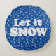 Round pillow in "Let it SNOW" word art patterned with white-on-white snow on a scattered snowflake background,- background colour can be customised by clicking on "edit design"