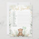 This elegant baby shower game features a cute teddy bear holding a heart-shaped balloon framed with a beautiful watercolor greenery wreath.