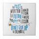 Encouraging quote, with playful typography. "The past is where you learned the lesson, the future is where you apply the lesson, don't give up in the middle" Great for students!