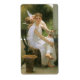 Work Interrupted (1891) by Bouguereau is a vintage Victorian mythology fine art realist portrait painting. A woman sitting on a chair with an angel. The cherub is whispering secrets in her ear.
