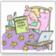 Fun sticker for anyone Working from Home. Girl Working from her Bed. WFH. Funny cartoon on a sticker.