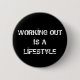 Round pin, white text "WORKING OUT IS A LIFESTYLE", black background