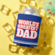 Bold graphic blue, white and red dad can cooler. Reads World's Greatest Dad. Personalise with a photo of you and your Dad on the reverse for a special gift for your father. Ideal for Father's Day, a birthday present, a Christmas Gift or just to show your thanks. Designed by Sarah Trett.