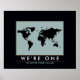 A graphic map of the world with a black frame and the inspirational text: 'we're one, no matter where you are'