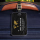 A modern black luggage tag with the image of a faux gold map of world