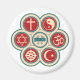 Six symbols of major world religions come together in a sign of coexisting and peace. Buddhism, Christianity, Hinduism, Islam, Judaism and Taoism. Peace symbol and Peace text in centre. Promote world peace!