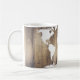 Rustic and elegant world traveller mug with rustic antique looking wood planks and a white world map silhouette.