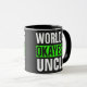 World's okayest uncle. World's in uppercase white black sans font. Okayest in black uppercase font with neon green coloured surround. Uncle in white uppercase font can be customised with another word or description.
