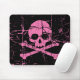 These t-shirts and other items are adorned with a worn and cracked skull and crossbones in a pink and black or pink and pink colour scheme.
