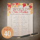 Would She Rather Fall Bridal Shower Party Game Notepad Pack of 40. Easy to tear away and write on. Featuring beautiful bright fall leaves on a washed wood background. Part of our fall in love collection.