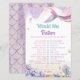 Add a splash of laughter to your celebration with this charming mermaid-themed “Would She Rather” game. Featuring a shimmering rainbow tail, soft blush and lavender watercolor details, and golden coastal accents, it blends elegance with fun. A playful way to see who knows the mom-to-be best.