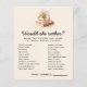 Add some laughter to your celebration with this Would She Rather – New Chapter Begins Bridal Shower Game! Inspired by the bride’s next big chapter, this fun and interactive game invites guests to guess what the bride-to-be would choose—from coffee or wine to beach days or movie nights. With elegant, book-themed design elements and customisable prompts, it perfectly complements any literary or “new chapter” bridal shower theme. Easy to print or display, it’s a great way to break the ice and get everyone involved in the celebration. A charming addition to your bridal shower game lineup!