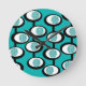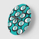 This clock has a Mid-Century Modern design of lines making circles inside ovals strung together in turquoise, black, and, white.