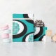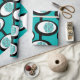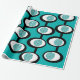 This wrapping paper has a Mid-Century Modern design of lines making circles inside ovals strung together in turquoise, black, and, white.