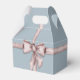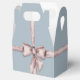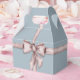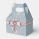 An adorable baby blue background with a watercolour dusty pink bow wrapped right around this favor box.