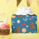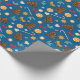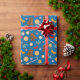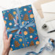 Wrapping Paper with a New Year's pattern, cute pictures of candies, lollipops and gingerbread cookies, bows and leaves on a blue background.