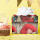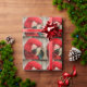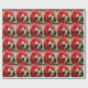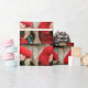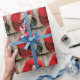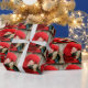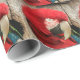 Wrapping paper featuring a green wing macaw parrot which is a red parrot. He is sticking his head out of his wooden barrel which is his nest.