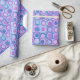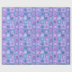 wrapping paper in repeating pattern of abstract squares and blobs, blue and lavender colour tones