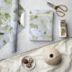 The hydrangea is a glorious, flowering shrub. The flowers can be pink, purple, blue, cream and, depending on the soil, magical combinations of these colours. In some varieties of hydrangea, the pH of the soil will determine the colour. Blue requires acidic soil, with a pH of about 5.0 to 5.5. Pink or purple requires an alkaline soil, with a pH of 6.5 to 7.0. Neutral soil will generally result in cream-coloured petals, but you can also get what some call "blurple" (blue and purple). Like clusters of tiny butterflies, the small florets gather into stunning spheres. The hydrangea is said to represent grace, friendship, lavish beauty and the preservation of love that lasts forever. This latter sentiment is likely why white hydrangeas are so popular for bridal bouquets. The pattern on this gorgeous wrapping paper repeats every three linear feet, but each wrapped gift will be covered in these spectacular white blooms. It is an excellent choice for birthdays, anniversaries and Mother's Day and a really good option for bridal showers and wedding presents.