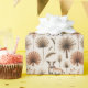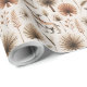 "Wrapping paper with a delicate botanical pattern featuring beige and brown flowers, branches, and leaves, displayed both unrolled and flat."