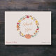 A Fall thank-you card on the theme of nature and the forest with a wreath and its maple, beech, oak and hazel leaves, mushroom, acorn, pumpkin, chestnuts and walnuts in autumn colours and a personalised message on the back.