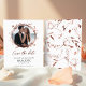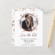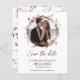 A simple and elegant wedding Save the Date card featuring chic floral wreath and rose gold foil design that is easy to personalise with your details. The card has a modern boho style, customisable calligraphy, handwritten font, and a wreath photo wedding invitation.