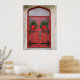 Two green wreaths, with festive red ribbons, adorn the beautiful red, gothic doors of an old stone church.