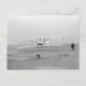 Wright Flyer - One of the first flights, 120 feet in 12 seconds, 10:35 a.m.; Kitty Hawk, North Carolina. Orville Wright at the controls of the machine, lying prone on the lower wing with hips in the cradle which operated the wing-warping mechanism. Wilbur Wright running alongside to balance the machine, has just released his hold on the forward upright of the right wing. The starting rail, the wing-rest, a coil box, and other items needed for flight preparation are visible behind the machine.