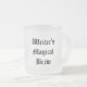 Our misty-frosted version of our Writer's Magical Brew mug. Bring magic and good luck to your writing, or to a friend's as a writer's gift, with this writer's tea or coffee (or witches' brew) mug. Whether your writing concoction contains pick-me-up caffeine, calming chamomile, cider, soda, or even lunchtime soup sipped at your writing desk, the crisp black ancient lettering can't help but inspire. And your brew will show through the misted glass. The text has been put in a special template to make it easy for you to change the words to your own if you choose. (When you go to the ordering page, you can change the mug design to many other sizes, colours, etc. with an easy click.)