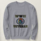 Rugged American Tank driving over rocks with flames blazing in the background, with an American flag waving from the top of the tank, all created in a circular oval emblem style logo. Headline, “WWII Veteran,” written above in metallic gold.