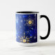 Blue Christmas background with gold and white jewelry snowflakes. Golden snowflakes. XMAS.