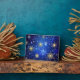 Blue Christmas background with gold and white jewelry snowflakes. Golden snowflakes. XMAS.