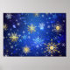 Blue Christmas background with gold and white jewellery snowflakes. Golden snowflakes. XMAS.