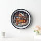 The size of the clock is dramatic and the abstract alcohol ink design is soothing and intricate at the same time. I chose the black frame that adds pop to the blue and gold design. The gold printing would be better in a slightly darker or larger font. I love it and I’m looking for just the right place in ny new apartment. I would recommend this clock for a personal gift or a present. I feel that the quality is excellent for the money! I’m a bit of a clock nut so I’m pretty particular about my purchases. The clock is larger in diameter than many if the clocks I have, so it stands out very well. I think a slightly darker printing color and a moderately larger size would best suit a professional decor or add more impact in a work place item.