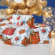 A seasonal holiday design of blue and white snowflakes topped with red packages, some with gold stars and gold ribbons and bows are featured in this Christmas / winter holiday design with a Scandinavian flair.