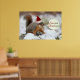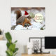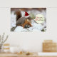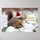 A squirrel wearing a Santa Claus hat is posing in the snow with a peanut in his mouth. "Season's Greetings" is written in red and green script in a speech bubble coming from the squirrel's mouth.
