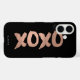 Kisses! Chic iPhone case features "XOXO" in trendy faux rose gold foil brushstroke typeface, on a sleek black background. Add a name, monogram or message, or simply clear the personalisation field for a clean look.