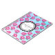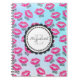 A personalised spiral notebook with a pattern of pink kissy lips and the text "xoxo!". Set on a turquoise blue watercolor background. Personalise with a name and monogram inside a cute whismsical circular frame.