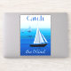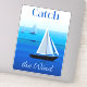 Sticker in Poster art of yachts at sea, with the phrase "catch the wind", on a cobalt and cerulean blue ocean background
