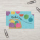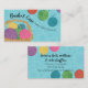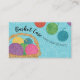 Colourful balls of yarn in a basket with modern patterned background on this business cards for knitting, crochet, and homespun yarn crafts.