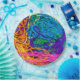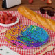 A photo of a tangled pile of brightly coloured yarn in pink, yellow, orange, green, blue and purple.