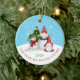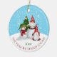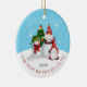 This funny holiday ornament features a couple of gnomes, snowman and Christmas tree on a blue and white snowy background with text "The Year We Stayed Gnome" and the year. Easy to personalise with custom options.