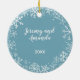 This beautiful 2-sided Christmas ornament is the perfect ornament for your yearly Christmas ornament! This is a beautiful keepsake for the entire family. Create a tradition by giving your child a gift of his own photo ornament each Christmas, or creating one for the whole family. The front side features your own photo inside agold snowflake frame, and the back side features your names, Christmas year, and the calender year inside a gold snowflake frame on a Christmas blue background. Easy to personalise with your own photo and information and the background colour is also customisable! Great Christmas gift!