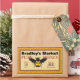 Graphic image of a yellow and black bumble bee over a subtle background pattern in warm colours, surrounded by an orange frame with vines and leaves. ❀ Customise the honey jar sticker with your business name or brand name, weight of the honey and "Best Before" date, or if you prefer, change the text to "Date Of / Harvest".