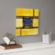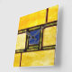 This square wall clock features an abstract design created from photos of a stained glass church window, in blue and yellow with brown and green accents.