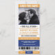 Sports ticket themed save the date invites are cool and fun! They look like a sports ticket to celebrate the event of the season. Colour palette in blue and yellow. Contact for custom colours.