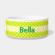 Colourful pet dish done in white ceramic, with a green on yellow polka dot pattern band around the bowl, with a yellow on white polka dot band in the middle. Green text, on the front, is ready to personalise for your pet.