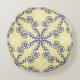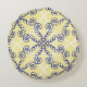 Round throw pillow with an ornate pattern in light yellow, navy blue, and white. Detailed and intricate scrollwork design.