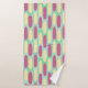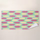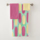 This towel set has a pale yellow washcloth, a purple-pink hand towel, and a bath towel with a geometric design of made of a background of sea-green and light blue rectangles with yellow and pink ovals on top.