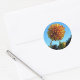 Add a cheery yellow and red dahlia sticker to your mailings, gift wrap, bridal shower gifts, notes, any place you can stick a sticker. The striped flower is vivid against the backdrop of the blue sky in this round sticker.